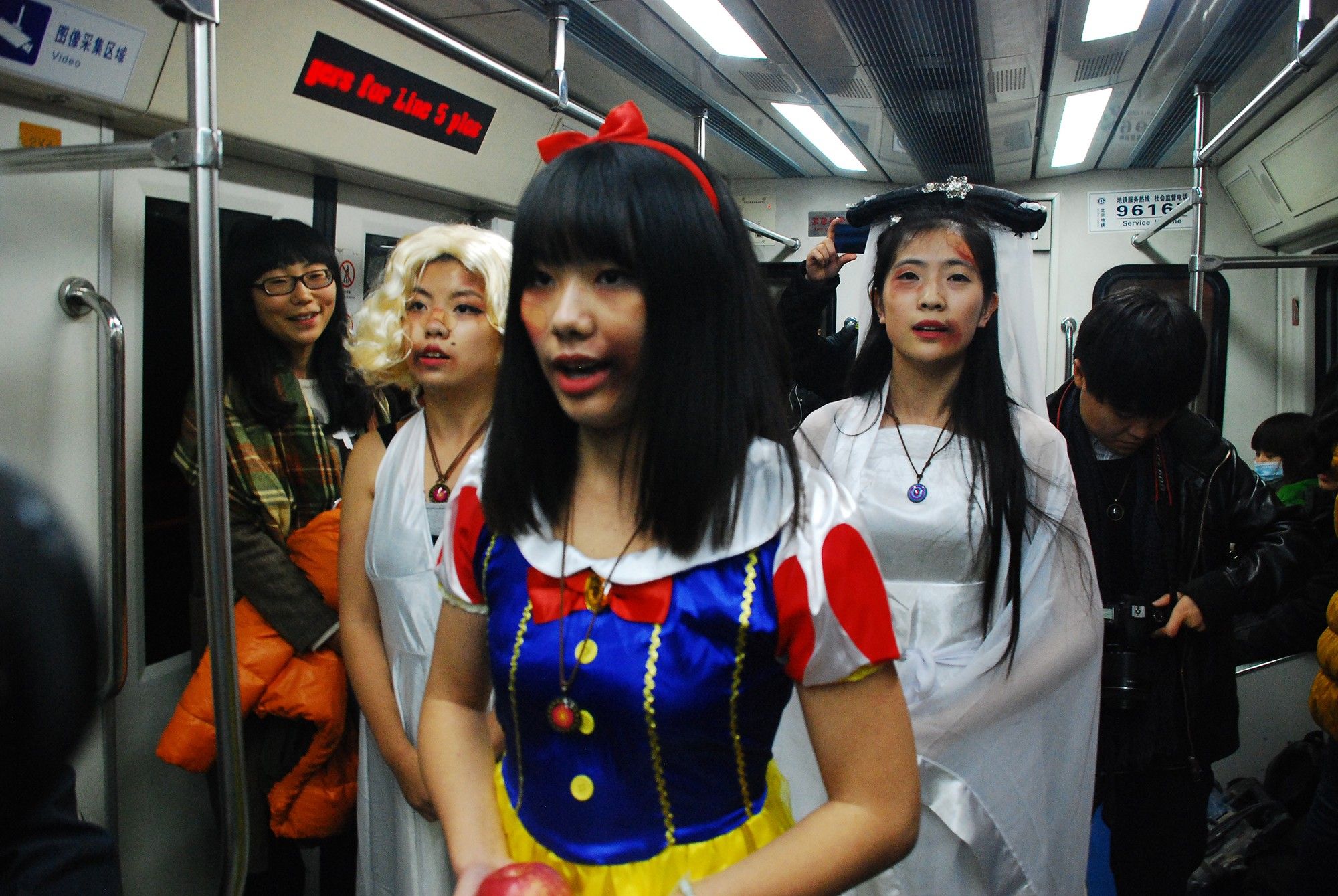 昨晚8点,地铁13号线上人来人往。一群女大学生登上车厢后,开始唱起了由《do you hear the people sing》改编的《女人之歌》,“我想出门不害怕,想亲密没有代价,请尊重我,别控制我,为何我失去自由?快停止吧,反省吧,爱不是暴力的借口……”其中三个学生还穿上白雪公主、白娘子和美国著名已故影星玛丽莲梦露的服装,用cosplay的方式演绎了这首歌。旁边还有志愿者发放印有反家暴小知识的卡片。