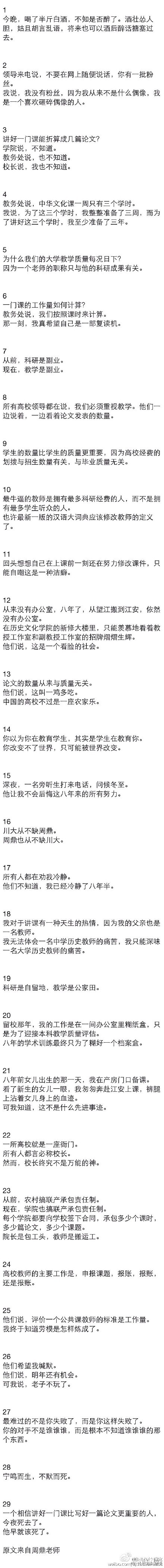 在这篇1300多字的“自白书”中,周鼎表示,一直以为教师最重要的工作是上好课,但如今教学似乎成了副业,这让他非常失望。他疑问:“为什么我们的大学教学质量每况日下?”并认为这是“因为一个老师的职称只与他的科研成果有关”。