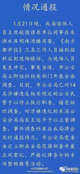 1月21日,深圳三名记者暗访警界十多名官员吃娃娃鱼,遭殴打抢相机。26日,深圳市公安局通报称,已经展开调查,对14名涉嫌违反相关规定的公安民警予以停止执行职务,接受组织调查。对涉嫌违纪的东深公安分局局长王远平予以立案调查。