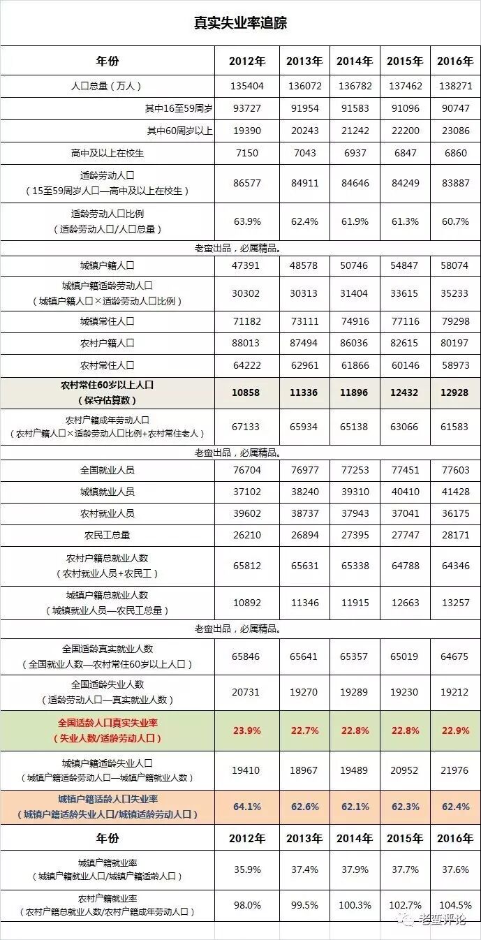 现在,我们可以给出我国2016年的真实失业率了:19212万失业人口÷83887万适龄人口=22.9%。以上的数据推演完全使用官方数据,老蛮我可以保证,连一个小数点都没有错误。触目惊心是吧?远远超出7%的国际失业警戒线是吧?看到就要吓尿是吧?如果本文只是推演出这么一个结果的话,老蛮我也还算不上国内首屈一指的经济数据狂。我们必须要回头仔细推演,到底是什么原因,导致了如此可怕的失业率!在这个匪夷所思的失业率背后,所隐藏着的,到底是什么样的真相!