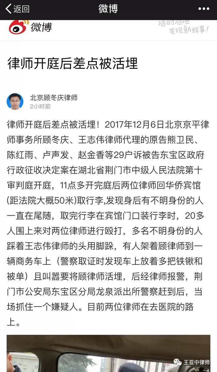 突发消息:北京律师顾冬庆、王志伟代理了一个“民告官”的拆迁案子,今天上午在湖北省荆门市中级人民法院开庭,被告是荆门市东宝区政府。开完庭,两位律师回到距离法院约50米的宾馆取行李,在宾馆门口被20多名不明身份的人围殴,有人把王志伟律师摁倒在地,乱脚跺头,还有人把顾冬庆律师驾到一辆商务车上,扬言要把顾律师活埋。后经路人报警,警察赶到现场,当场抓获一人,缴获多把铁锹和被单。