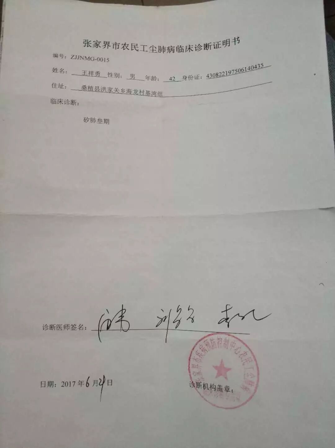 为了刚出生的孩子,王祥勇在2009年之后依然拼命打工,在深圳从事爆破工作,一直到逐渐发觉自己干不动了,病倒了。2017年1月,王祥勇回家乡治疗。6月份,为了统计尘肺病人状况,湖南省给予了大家进行尘肺病体检的机会,王祥勇不幸被诊断为三期。