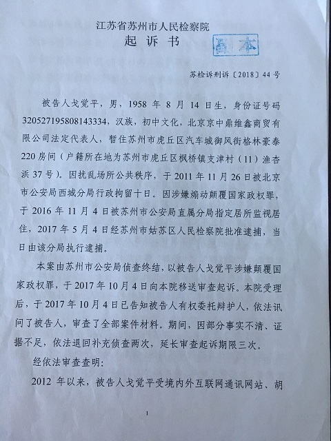 被告人戈觉平,男,1958年8月14日生,身份证号码320527195808143334,汉族,初中文化,北京京中鼎维鑫商贸有限公司法定代表人,暂住苏州市虎丘区汽车城御风街格林豪泰220房间(户籍所在地为苏州市虎丘区枫桥镇支津村(11)渔杏浜37号)。因扰乱场所公共秩序,于2011年11月26日被北京市公安局西城分局行政拘留十日。因涉嫌煽动颠覆国家政权罪,于2016年11月4日被苏州市公安局直属分局指定居所监视居住,2017年5月4日经苏州市姑苏区人民检察院批准逮捕,当日由该分局执行逮捕。