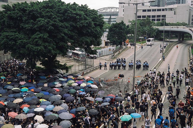 示威者佔領了香港商業區多條主要幹道,與警方爆發衝突,情況與2014年「佔領中環」的情況差不多。警察多次施放催淚彈、橡膠子彈等嘗試驅散示威者。