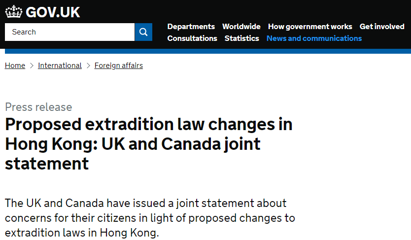 兩國政府在聲明表示,關注修例會對在香港的英國和加拿大公民帶來影響,也會影響香港的商業聲譽,強調修例建議必須經過「最嚴謹」的審議。