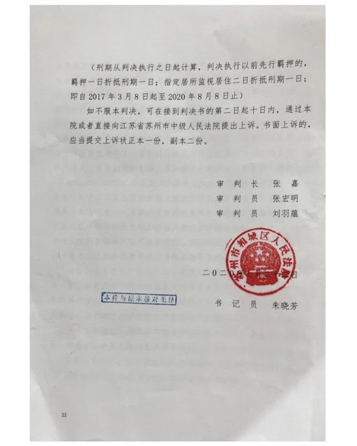2020年7月22日,苏州维权人士吴其和被苏州市相城区法院以寻衅滋事罪判处有期徒刑三年零八个月,吴其和当庭提出了上诉。
