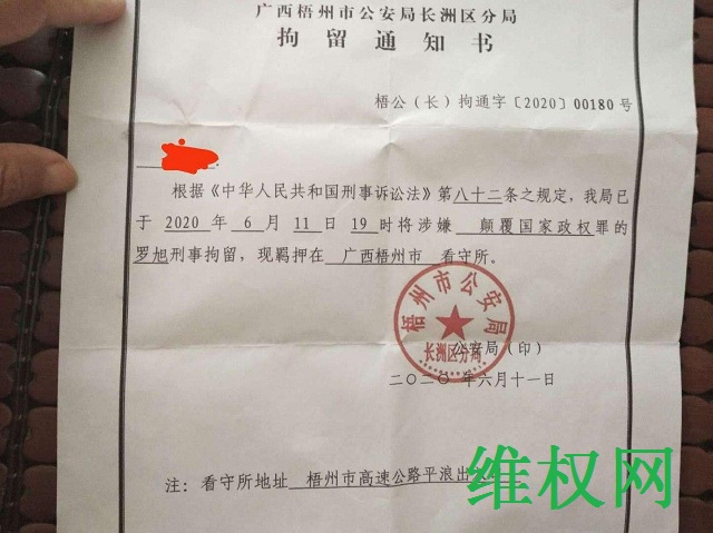 2020年6月11日,广西梧州公民、民国史网创建者罗旭被梧州市长洲区警方以涉嫌“煽动颠覆国家政权罪”刑事拘留,至今被羁押。
