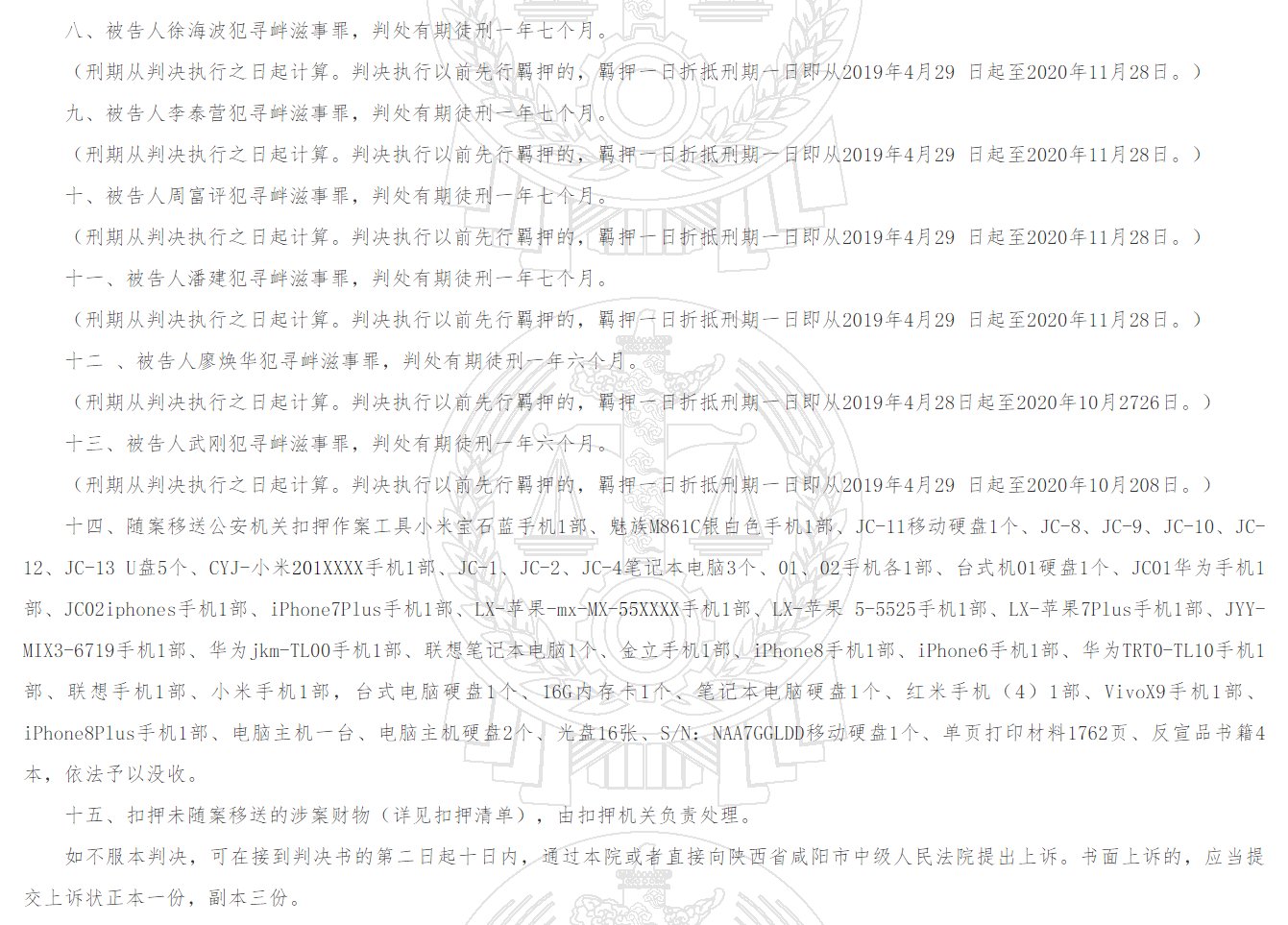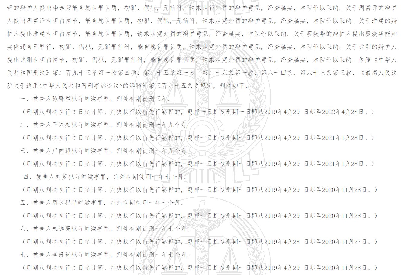 其中,陈鹰军在庭审中只高喊口号,不做辩护,后被判刑3年,刑期至2022年4月28日。王兴杰、卢向辉被判刑1年9个月,刑期至:2021年1月28日;刘芗、周昱、朱远亮、李好轩、徐海波、李泰营、周福评、潘建等8人被判刑1年7个月,刑期至2020年11月28日;廖焕华、武刚被判刑1年6个月,刑期至:2020年10月28日。廖焕华、武刚已获释。