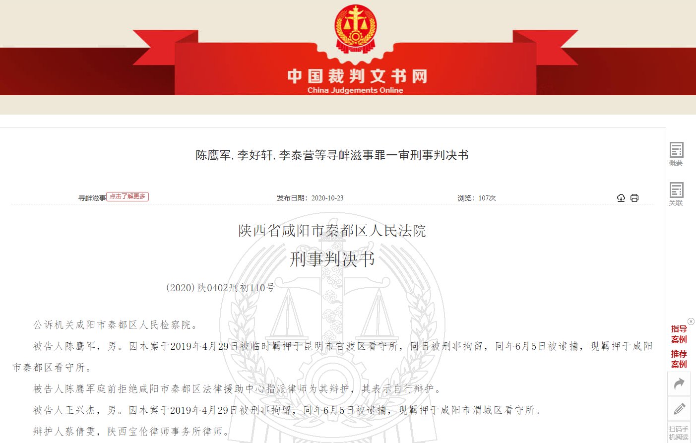 陕西咸阳网民陈鹰军、王兴杰等13人因在QQ群传播涉及政治的内容于2019年4月29日被抓捕,2020年9月被咸阳市秦都区法院以寻衅滋事罪判刑3年至1年半有期徒刑。判决书指控他们通过QQ群有组织地传播“涉及政治的谣言”,攻击政府、党和国家领导人。据判决书称该组织首脑人物雷某某已经死亡,不清楚死因是否与本案有关。